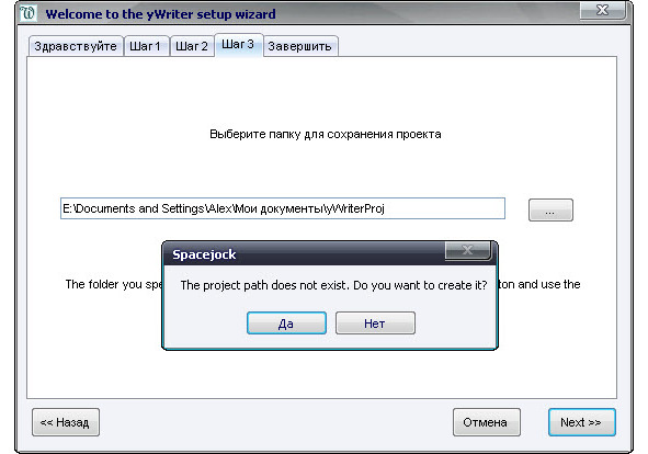 Выбираем место хранения проекта. Вы можете оставить предложенный путь и название проекта, а можете выбрать свое. Если папки с таким именем не существует, yWriter5 предложит ее создать. Для ее создания нажмите «Да». Это как в загсе – коротенькое слово, и вся жизнь поменялась.