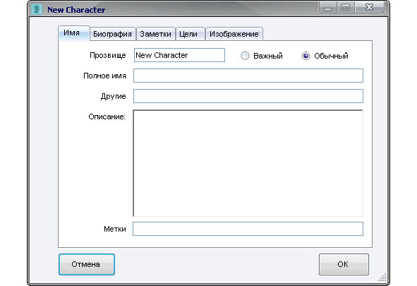 В нем и создаем первый персонаж. По умолчанию в поле для имен стоит «New Character», заменяем его именем главного героя. Даже если вы пишите научные книги, у вас все равно есть главный герой. Этот герой, от имени которого и ведется повествование, это вы сами. Поэтому для авторов научных и научно-популярных книг я рекомендую создать по крайней мере один персонаж с именем «Автор» и не забыть поставить отметку в поле «Важный». Дальше пишем полное имя персонажа, прозвище, кличку, основные жизненные цели, биографию, особенности характера, вставляем изображение. Все эти сведения нам пригодятся при дальнейшей работе над романом. Лучше будет сразу создать записи и для других персонажей, чтобы в дальнейшем не забыть, кто из них жив, а кто погиб, кто до конца будет сражаться, кто струсит. А то если в середине романа вы перепутаете отчество главного героя, образ может получиться не слишком убедительным. Я имею в виду не образ главного героя, а ваше реноме как писателя.