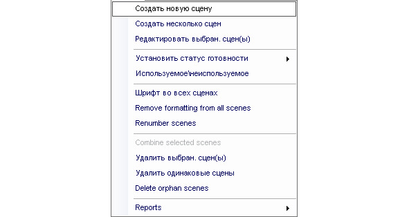 Самыми важными в вкладке «Детали» являются термины поля «Статус». Где «Draft» означает «Черновик», «Outline» значит «План», дальше соответственно – 1-я и 2-я редакции и окончательный вариант -«Done», что означает «Готово». От того, что Вы здесь выберете, зависит готовность вашего бестселлера. О типах сцены, выбираемых во вкладке «Детали», мы поговорим отдельно.