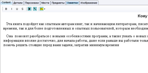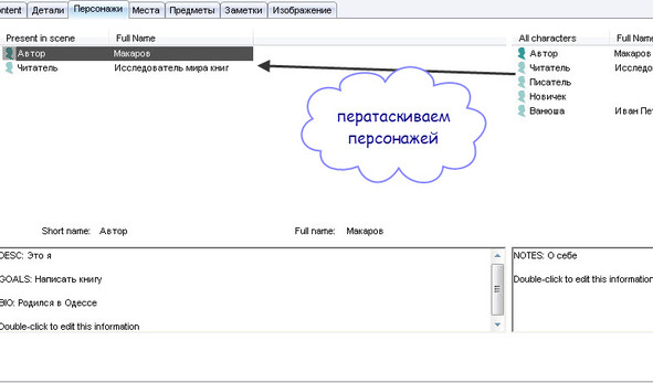 В меню, расположенном над окном для текста, уточняем, какие персонажи относятся к данной сцене, какие места и предметы из книги будут отражены в данной сцене. Во время редактирования персонажей, мест действия и предметов, для введения их в данную сцену – просто перетаскиваем их из правой части окошка в левую.