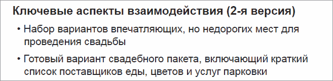 Пожалуй, еще лучше будет использовать узнаваемое изображение, описывающее различия между пакетами. Например, рядом с пакетом верхнего ценового сегмента может быть изображен лимузин с надписью «Молодожены» на заднем окне, а рядом с пакетом эконом-класса может быть изображен обычный компактный автомобиль. Подсказки 3 и 4 проявились тогда, когда Бита с Эной заметили, что DIRECTV упорядочивает пакеты по возрастанию цены. В ходе прокрутки списка пользователь видит, что более дорогие пакеты содержат больше предложений и занимают вдвое больше места.