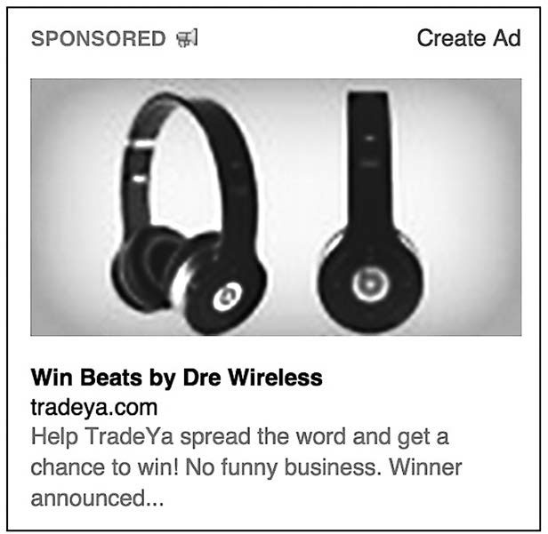 Другая причина для экспериментов со страницами перехода – генерирование заинтересованных клиентов (лидов). Целью является получение максимально возможного количества адресов электронной почты реальных людей, которые в той или иной степени соприкоснулись с предлагаемой ценностью. В главе 7 я объяснила, как Джаред создал продающее видео с описанием преимуществ обмена. Это событие, произошедшее до фазы тестирования MVP, было хорошим примером привлечения клиентов через страницы перехода. Сначала Джаред провел рекламную кампанию на Facebook. Своей целевой аудиторией он считал пользователей Facebook, которые жили в США и которые поставили лайки на странице электроники Beats by Dre. Он провел две рекламные кампании, одна из которых показана на рис. 9.20.