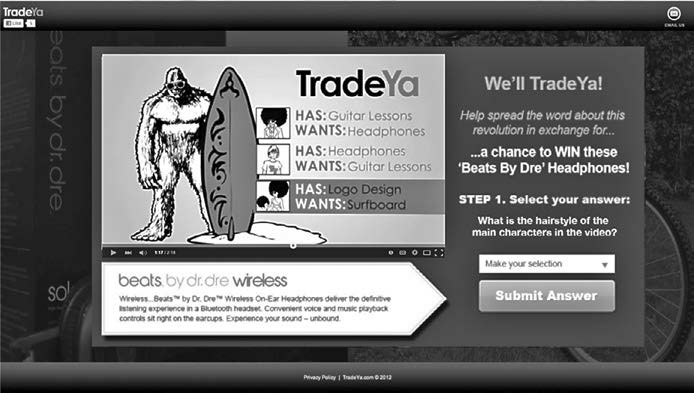 Пользователи, щелкнувшие на ссылке, оказывались на странице перехода (рис. 9.21), содержавшей продающее видео. Фактически Джаред использовал призы для привлечения трафика на страницу перехода. Когда пользователь прибывал на страницу, он не мог просто оставить свой адрес электронной почты для конкурса и уйти. Вместо этого он должен был просмотреть видео и дать хотя бы один качественный ответ на вопрос. Это означало, что потенциальный клиент должен был посмотреть видео минимум пять секунд, что в свою очередь свидетельствовало о том, что они вступили в контакт с предлагаемой ценностью. Джареду были нужны адреса электронной почты только тех потенциальных клиентов, которые получили представление о предлагаемой ценности TradeYa.