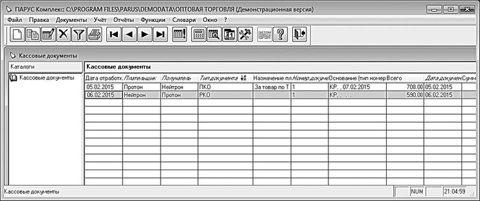 Вдоль нижней границы окна находится строка состояния – информационный элемент, в котором отображаются сведения о текущем режиме работы (на рис. 6.1 в ней содержится запись Кассовые документы), а также прочая дополнительная информация.