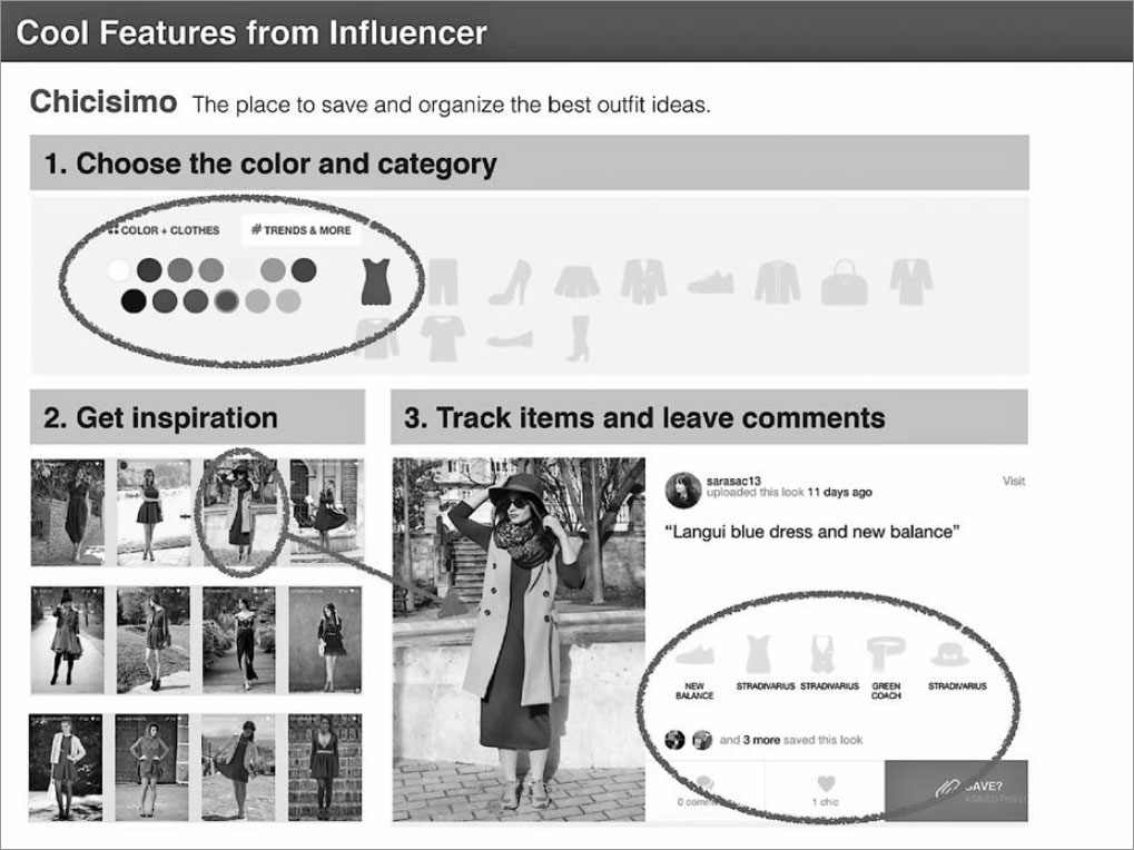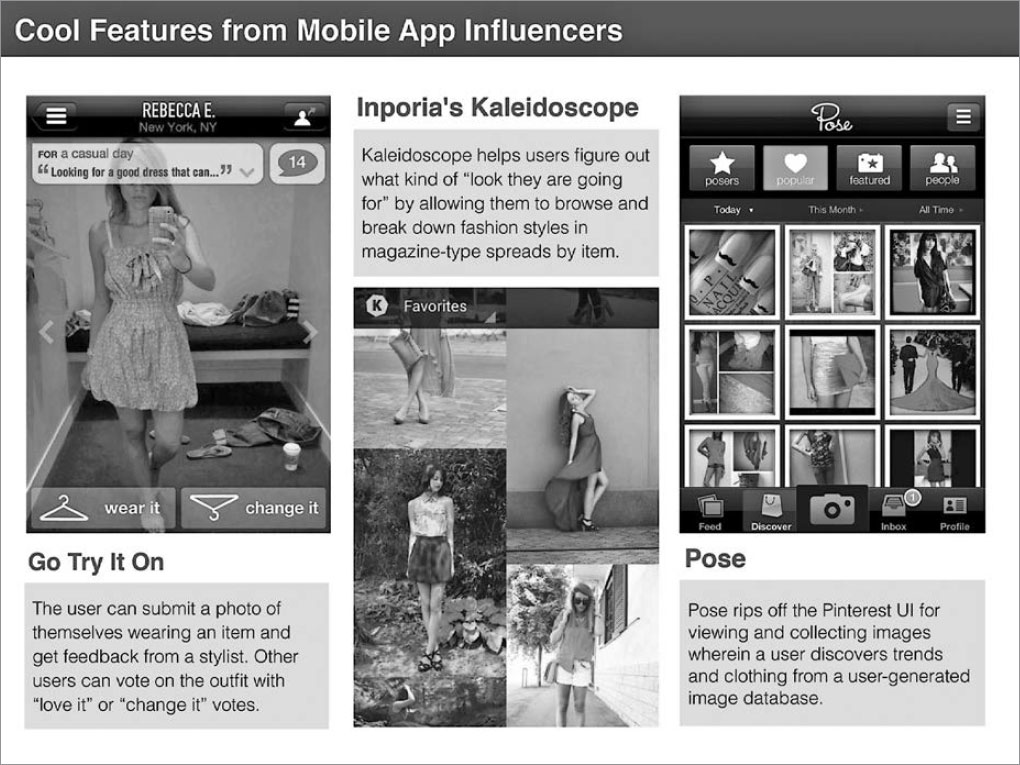 В этом разделе следует написать обо всех интересных и актуальных возможностях UX или информации о рынке из источников, не связанных с конкурентами (рис. 5.11 и 5.12). Я называю такие продукты «источниками влияния» (influencers), потому что они не входят в конкурентную среду вашего продукта, но могут предоставить информацию о его инновации ценности. Источник влияния даже не обязан быть онлайновым продуктом. Если в нем присутствует взаимодействие или возможность, которую вы хотели бы включить в свой продукт, – это источник влияния.
