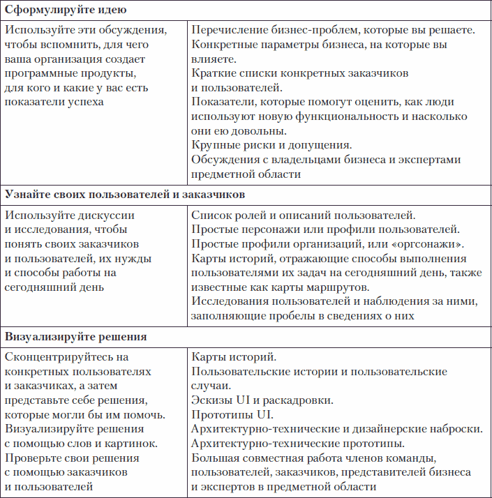 Существует очень много действий, которые вы и ваша команда можете проделать, и артефактов, которые вы можете создать, проводя исследование. Эта простая таблица даст вам некоторое представление о том, что вы можете использовать. Не стоит пытаться выполнить сразу все – это излишне, но и не ограничивайтесь лишь тем, что перечислено здесь, ведь наверняка существуют и другие методы, которые больше подойдут в вашей ситуации с учетом имеющихся у вас возможностей и навыков. Главное – не просто сидеть в комнате и писать бесконечное количество историй. Это глупо.