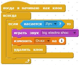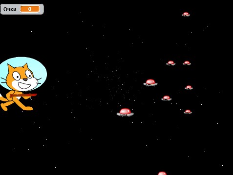 В этой игре будет всего четырнадцать спрайтов. Кот, Луч бластера, вражеский НЛО, три звёздочки и восемь букв. На картинке Вы видите не один НЛО, а несколько. Это клоны одного спрайта, которые полностью похожи на него и имеют такую же программу.