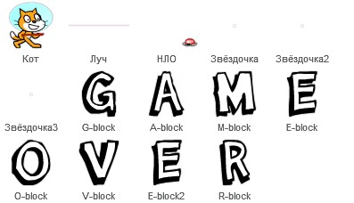 Костюм звёздочки готов. Осталось только добавить буквы для надписи «GAME OVER» (игра окончена). Выберем их из библиотеки спрайтов.