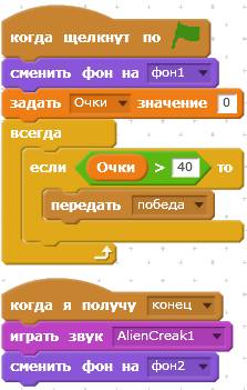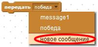 Сделайте программу для сцены. В ней всего два скрипта. Первый скрипт задаёт начальное значение переменной «Очки», и ждёт, пока Кот насшибает 40 НЛО. Когда это произойдёт, он передаст сообщение «победа». Если же Кот не сможет победить захватчиков и погибнет в неравном бою, то будет передано сообщение «конец», при получении которого сцена изменит костюм чёрного космоса на серую заставку. Для того, чтобы создать новое сообщение, кликните на чёрный треугольничек, и выберите из выпадающего списка “новое сообщение».