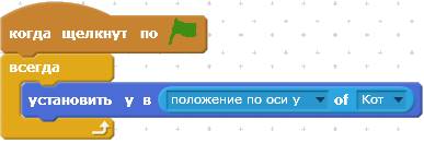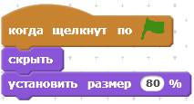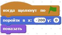 После этого сделайте программу для Кота. В ней будет пять скриптов. Первый скрипт перемещает Кота в левую часть экрана и делает его видимым.