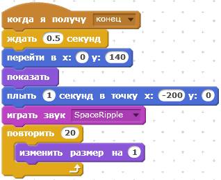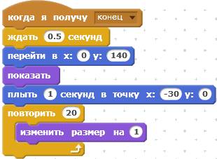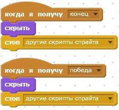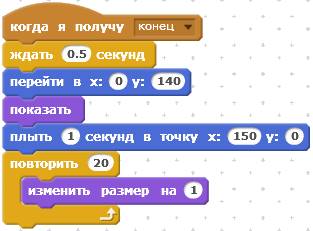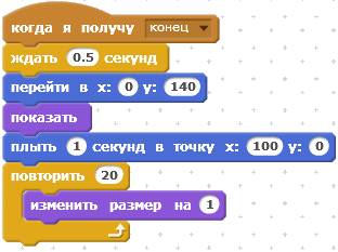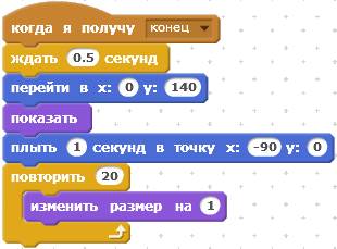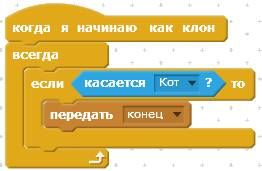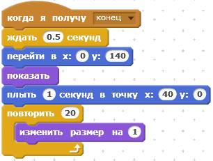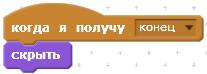 Следующий скрипт отрабатывает сообщение «конец». При получении этого сообщения Кот исчезнет.