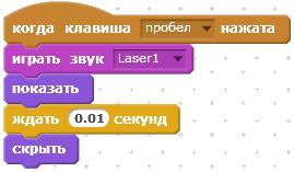 Второй скрипт — скрипт выстрела. При нажатии клавиши Пробел слышен звук, и на одну сотую долю секунды мелькает луч бластера.