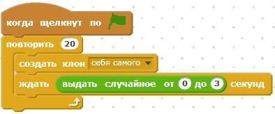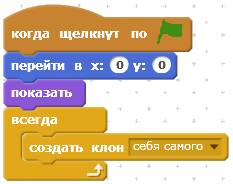 Теперь запрограммируем звёздочку. У неё будет пять скриптов. Первый скрипт помещает звёздочку в центр экрана и постоянно создавать её новые клоны.