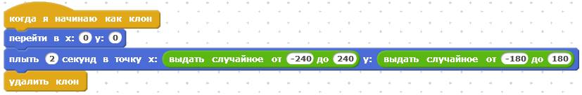 Второй скрипт отправляет всех клонов звёздочки в двухсекундное плавание в неизвестном направлении. Координаты точки назначения Х и Y выбираются случайным образом. После того, как клон звёздочки доплывёт до точки назначения, он исчезает.