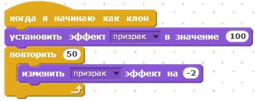 Третий скрипт, при появлении нового клона звёздочки, устанавливает эффект призрак в значение 100, тем самым делая клонов звёздочки невидимыми. Потом значение невидимости плавно изменяется до ноля (если 50 раз отнять 2 от 100, получится 0). При этом будет казаться, что звёзды как будто выплывают из глубин космоса.
