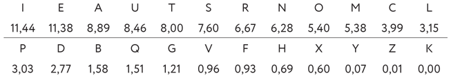 Расставим буквы латинского алфавита[31] согласно порядку убывания их относительных частот в латинском языке:[32]
