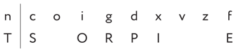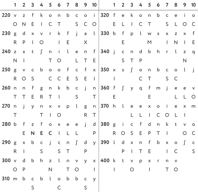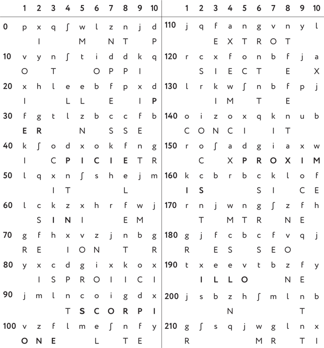 В логогрифе есть сочетание букв nco (94, эта группа частично входит в первое появление coigdxv); выше мы уже предположили, что это наиболее частые согласные. Из них можно составить всевозможные триграммы TSR, TSN, TRS, TRN, TNS, TNR, STR, STN, SRT и т. д. (всего существует 64 подобные трехбуквенные группы), которые могут находиться в любой части слова. Триграмма STR кажется перспективной. Например, она встречается в таких латинских словах, как astrum (звезда), strix (сова ушастая, сипуха) и других. Увы, изучив более подробно эту гипотезу (как и все другие случаи), никаких достоверных выводов сделать не удастся. Возможно, потому что эти три буквы распределились среди не одного, а двух слов? Нет, дело в другом: ни одна из триграмм вообще не является верной дешифровкой символов nco (это еще одна наша, четвертая уже по счету, подсказка, данная, чтобы читатель не продолжал бесплодные попытки проверки этой гипотезы).
