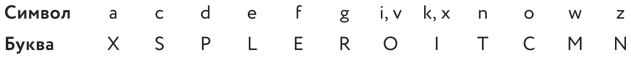 Давайте сначала внимательно рассмотрим в этих группах триграммы ang и adg. Воспользуемся предположением, приведенным выше: символ n обозначает либо T, либо S, либо R, либо N. Пусть это будет T; остановимся на этой букве, так как у n и T относительные частоты достаточно близки (8,41 % и 8,00 %), а у остальных букв-кандидатов она несколько ниже. Символ g (4,41 %) встречается реже (примерно в полтора раза), чем оставшиеся согласные S (7,60 %), R (6,67 %), N (6,28 %). Может быть, все эти частые согласные заменяются двумя символами? Что же теперь в свете этой информации мы можем сказать о символе а (1,23 %)? Он по встречаемости в табл. 2 третий с конца. Сравним его относительную частоту с относительными частотами последних букв в табл. 1. Возможно, это буква X (0,60 %)?[35] Тогда имеем возможные триграммы: XTS, XTR, XTN. В этом случае, в отличие от вышеприведенного, наш выбор невелик, фактически он единственен: ang = XTR, так как только эта триграмма из приведенных трех хорошо «обрамляется» по бокам гласными. Очевидно, что предшествующая гласная (символ f, занимающий верхнюю позицию в табл. 2) – это буква Е, которая стоит одной из первых в табл. 1, и тогда fang = EXTR.