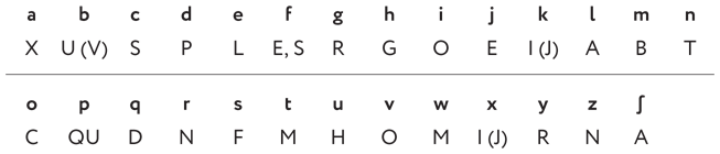 Первое наблюдение, которое сделал Специали: загадка содержит 26 букв современного английского алфавита и знак ? (вытянутая буква s). Но классический латинский алфавит имеет только 23 буквы. Пять наиболее частых I, E, A, U, T – это примерно половина (48,17 %) любого латинского текста. В нашей криптограмме, в которой 408 знаков, каждая из этих букв должна появиться примерно по 40 раз. Самый частый у нас символ n, но и он встречается «всего лишь» 34 раза. По-видимому, это означает, что Эйлер использовал по крайней мере два представления (называемых омофонами) для самых частых букв. Изменяя таким образом частоты, ученый пытался сделать логогриф неуязвимым для частотного анализа. Как видим, Эйлер кое-что знал о простейших шифрах и методах их взлома. Логогриф Эйлера относится к шифрам многозначной замены (его также можно классифицировать с некоторыми оговорками и как омофонический шифр).