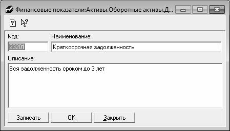 После построения структуры папок можно приступать к заполнению папок финансовыми показателями. Чтобы зарегистрировать в каталоге новый финансовый показатель, следует переместить курсор в правую часть окна и выполнить команду главного меню Действия?Добавить (данная команда вызывается также нажатием клавиши Insert) либо нажать соответствующую кнопку инструментальной панели. Чтобы просмотреть и, при необходимости – отредактировать параметры сформированного ранее финансового показателя, дважды щелкните на нем мышью или используйте команду Действия?Изменить, вызываемую также нажатием комбинации клавиш Shift+Enter. В результате выполнения любого из перечисленных действий на экране откроется окно редактирования финансового показателя, изображенное на рис. 4.5.