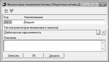 Данный интерфейс во многом аналогичен уже знакомому нам окну ввода и редактирования папки, с которым мы познакомились чуть выше (см. рис. 4.4). Исключением является лишь то, что в окне редактирования финансового показателя имеется также поле Тип показателя (для финансового анализа). Значение данного поля используется при проведении финансового анализа структуры средств предприятия; оно указывает, к какой группе активов либо пассивов аналитического баланса будут отнесены итоговые данные по этому финансовому показателю. Для заполнения данного поля нужно нажать кнопку выбора, затем в открывшемся окне справочника Аналитический баланс выделить курсором требуемую позицию и нажать клавишу Enter либо дважды щелкнуть мышью. Чтобы очистить значение поля Тип показателя (для финансового анализа), нужно нажать кнопку с символом Х, расположенную справа от кнопки выбора.