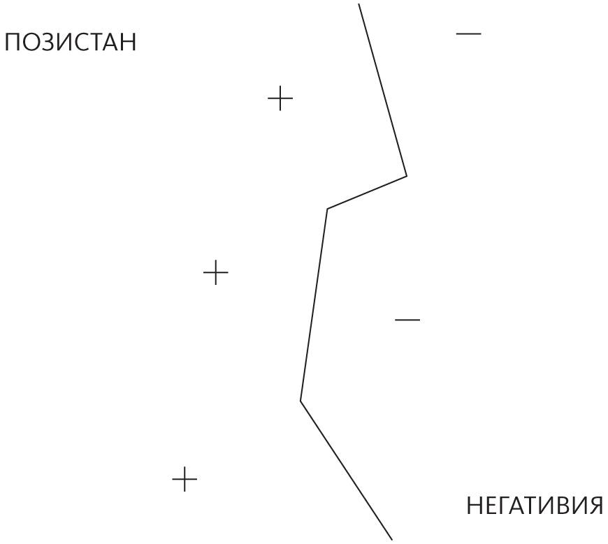 На первый взгляд метод опорных векторов во многом похож на взвешенный алгоритм k-ближайших соседей: граница между положительными и отрицательными классами определяется мерой схожести примеров и их весами. Тестовый пример принадлежит к положительному классу, если в среднем он выглядит более похожим на положительные примеры, чем на отрицательные. Среднее взвешивается, и метод опорных векторов помнит только ключевые примеры, необходимые для проведения границы. Если еще раз посмотреть на Позистан и Негативию без городов, не расположенных на границе, останется такая карта: