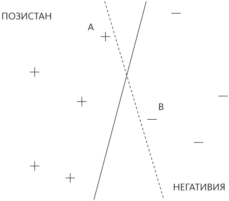 Чтобы обучить метод опорных векторов, нужно выбрать опорные векторы и их вес. Меру схожести, которая в мире опорных векторов называется ядром, обычно назначают априорно. Одним из важнейших открытий Вапника было то, что не все границы, отделяющие положительные тренировочные примеры от отрицательных, равноценны. Представьте, что Позистан воюет с Негативией и государства разделены нейтральной полосой с минными полями с обеих сторон. Ваша задача — исследовать эту ничейную землю, пройдя с одного ее конца к другому, и не взлететь на воздух. К счастью, у вас в руках карта c расположением мин. Вы, понятное дело, выберете не просто любую старую тропинку, а станете обходить мины как можно более широким кругом. Именно так поступает метод опорных векторов: мины для него — это примеры, а найденная тропа — выученная граница. Самое близкое место, где граница подходит к примеру, — ее зазор, и метод опорных векторов выбирает опорные векторы и веса так, чтобы зазор был максимальным. Например, сплошная прямая граница на этом рисунке лучше, чем пунктирная: