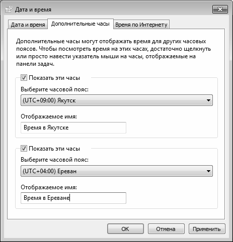 Возможности Windows 7 предусматривают использование нескольких системных часов – для разных часовых поясов. Эту возможность удобно использовать, например, если разные офисы компании находятся в разных часовых поясах, а также в иных случаях. Для выполнения соответствующих настроек нужно в окне Дата и время перейти на вкладку Дополнительные часы, содержимое которой показано на рис. 3.32.