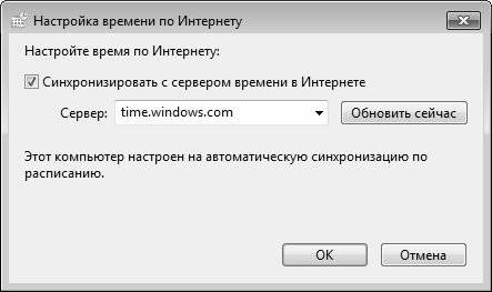 Чтобы включить режим автоматической синхронизации времени, нужно в данном окне установить флажок Синхронизировать с сервером времени в Интернете, после чего в поле Сервер выбрать из раскрывающегося списка подходящий тайм-сервер и нажать кнопку ОК. С помощью кнопки Обновить сейчас можно выполнить немедленную синхронизацию времени с сервером, указанным в поле Сервер. Отметим, что по умолчанию режим автоматической синхронизации включен, а в качестве тайм-сервера предлагается time.windows.com.