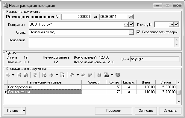 Чтобы сохранить введенный документ, нажмите кнопку Записать. Однако по учету документ будет проведен только после нажатия кнопки Провести (после этого кнопка будет называться Отменить проведение, и с ее помощью можно в любой момент отменить проведение документа по учету). Не стоит забывать, что редактировать можно только непроведенные документы.