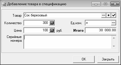 После заполнения всех необходимых параметров нажмите кнопку ОК – в результате товар будет добавлен в спецификацию документа.