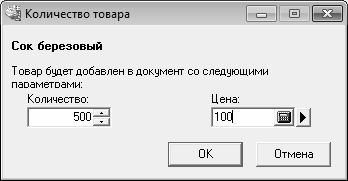 В соответствующих полях данного окна следует указать количество добавляемого товара и цену за единицу, после чего нажать кнопку ОК.