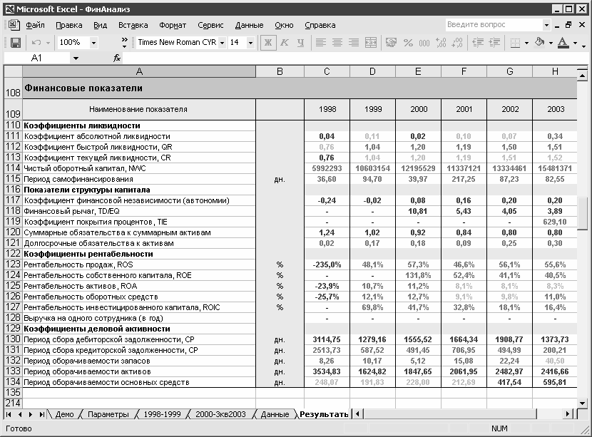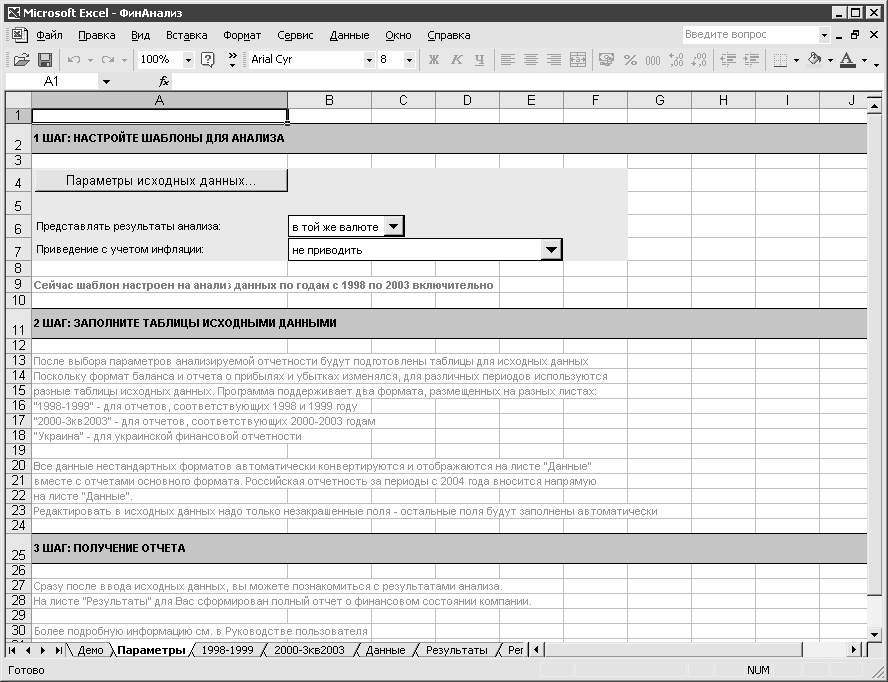 Модуль Финансовый анализ работает в среде редактора MS Excel. Он включает в себя несколько листов, на каждом из которых выполняются соответствующие операции.