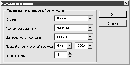 Чуть ниже кнопки Параметры исходных данных находятся поля Представлять результаты анализа иПриведение с учетом инфляции (см. рис. 1.1). В первом из них указывается наименование валюты, которая будет использоваться для представления результатов анализа. Возможные значения: в той же валюте, в долларах США или в евро.