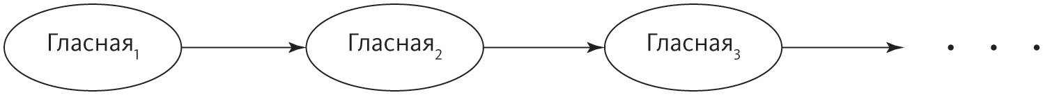 В преддверии Первой мировой войны русский математик Андрей Марков опубликовал статью, где вероятности применялись, помимо всего прочего, к поэзии. В своей работе он моделировал классику русской литературы — пушкинского «Евгения Онегина» — с помощью подхода, который мы сейчас называем цепью Маркова. Вместо того чтобы предположить, что каждая буква сгенерирована случайно, независимо от остальных, Марков ввел абсолютный минимум последовательной структуры: допустил, что вероятность появления той или иной буквы зависит от буквы, непосредственно ей предшествующей. Он показал, что, например, гласные и согласные обычно чередуются, поэтому, если вы видите согласную, следующая буква (если игнорировать знаки пунктуации и пробелы) с намного большей вероятностью будет гласной, чем если бы буквы друг от друга не зависели. Может показаться, что это невеликое достижение, но до появления компьютеров требовалось много часов вручную подсчитывать символы, и идея была довольно новой. Если гласнаяi — это булева переменная, которая верна, если i-я по счету буква «Евгения Онегина» — гласная, и неверна, если она согласная, можно представить модель Маркова как похожий на цепочку график со стрелками между узлами, указывающими на прямую зависимость между соответствующими переменными: