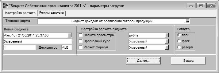 В заголовке окна отображается наименование бюджета с указанием центра ответственности и периода планирования. На рисунке видно, что данное окно состоит из двух вкладок: Настройка расчета и Режим загрузки. В первую очередь рассмотрим параметры, которые являются общими для обеих вкладок.