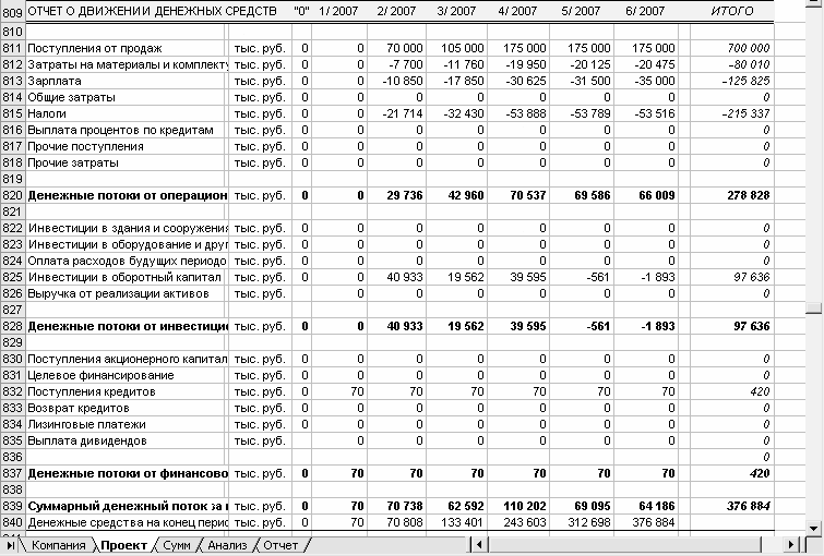 Теперь можно посмотреть таблицу Отчет о движении денежных средств, которая также находится в отчетной части листа Проект. Применительно к нашему примеру таблица будет выглядеть так, как показано на рис. 3.25.