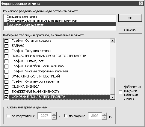 В данном окне в поле Из какого раздела модели надо готовить отчет укажем наш проект – Торговое оборудование, и выберем отчет Основные показатели проекта. После нажатия кнопки ОК откроется лист Отчет (рис. 3.27).