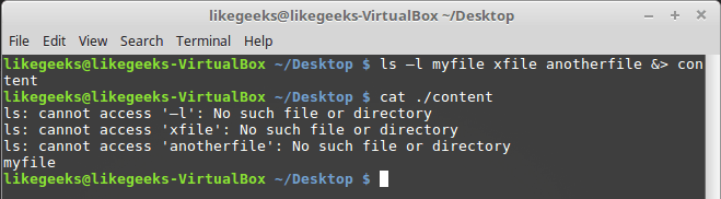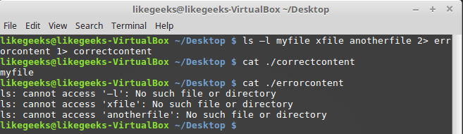 Оболочка перенаправит то, что команда ls обычно отправляет в STDOUT, в файл correctcontent благодаря конструкции 1>. Сообщения об ошибках, которые попали бы в STDERR, оказываются в файле errorcontent из-за команды перенаправления 2>.