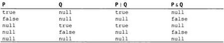 Если в логическом выражении участвуют два объекта типа bool?, то его результат может иметь одно из трех следующих значений: true (истинное), false (ложное) или null (неопределенное). Ниже приведены результаты применения логических операторов & и | к объектам типа bool?.