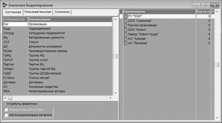 С помощью команды Н?Аналитика бюджетирования осуществляется переход в режим работы со списком значений аналитик, учитываемых в бюджетировании. При привязке типовой финансовой операции (ТФО) к документу автоматически формируется финансовая операция с аналитикой бюджетирования, определенной из аналитики документа согласно этому каталогу и группе аналитик статьи бюджета, которая привязана к финансовой операции. Необходимо отметить, что при удалении некоторого значения аналитики оно учитывается как прочие значения аналитики.