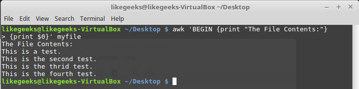 Сначала awk исполняет блок BEGIN, после чего выполняется обработка данных. Будьте внимательны с одинарными кавычками, используя подобные конструкции в командной строке. Обратите внимание на то, что и блок BEGIN, и команды обработки потока, являются в представлении awk одной строкой. Первая одинарная кавычка, ограничивающая эту строку, стоит перед BEGIN. Вторая — после закрывающей фигурной скобки команды обработки данных.