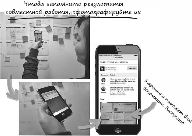 После того как все мы вместе отлично поработали, чтобы прийти к общей точке зрения, нужно сохранить копии всех созданных моделей или примеров, чтобы использовать их в качестве «отпускных фотографий». В дальнейшем они помогут нам припомнить дискуссию в деталях. В продуктах наподобие Atlassian Confluence предлагается вики-движок с широкими возможностями, где вы можете использовать не только слова, но и картинки или видео. Самые быстрые способы создания документации – это фотографии или короткие видео по результатам совместной работы.