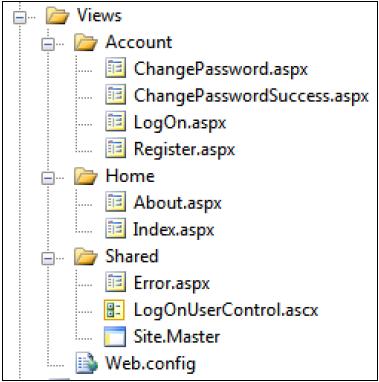 В папке Views размещаются файлы представления. В качестве стандартного механизма представлений в MVC Framework используются ASPX-файлы для создания представлений, MASTER-файлы для создания шаблонов общей разметки части представлений, а также ASCX-файлы для создания частичных представлений для многократного использования в составе других представлений.