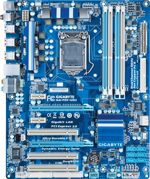 GA-EP55-UD3 предназначается для процессоров Intel, устанавливаемых в гнездо LGA 1156. Она оснащена разъемом PCI Express 2.0 x16, обеспечивает работу наиболее производительных видеоадаптеров основных конкурентов на рынке графических адаптеров, также предусматриваются разъем PCI Express x4, два PCI Express x1 (при необходимости можно использовать графические платы в спарке ATI CrossFireX) и три обычных PCI. Разъемов для DIMM четыре (для двухканальной памяти DDR3 2200+/1333/1066/800 МГц), максимальная емкость ОЗУ – до 16 Гбайт (актуально при переходе на 64-разрядные системы). Плата позволяет задействовать преимущества спецификации Extreme Memory Profile (если модули памяти также совместимы с ней). Кроме того, у тех, кто решит собирать компьютер на основе этой системной платы, появится возможность опробовать наиболее скоростные на сегодня накопители из предназначенных для потребительского рынка.
