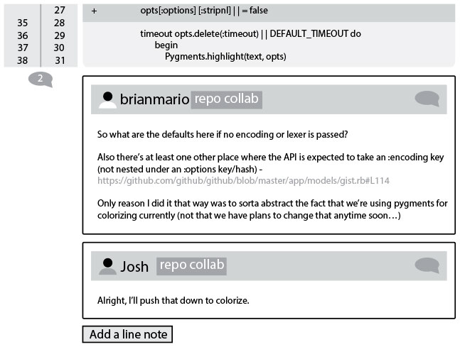 Рис. 40. Комментарии и предложения к запросу внесение изменений, GitHub (источник: Скотт Чикон, “GitHub Flow”, сайт ScottChacon.com, 31 августа 2011 г., http://scottchacon.com/2011/08/31/github-flow.html)