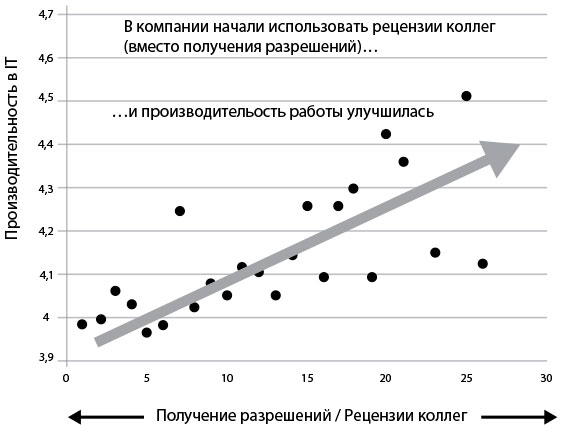 Один из важнейших постулатов системы производства Toyota — «самые близкие к проблеме исполнители обычно знают о ней больше всего». Это особенно заметно, если выполняемая работа или рабочая система становятся более сложной и динамичной, что характерно как раз для потоков создания ценности DevOps. В таких случаях потребность в разрешении руководителей, находящихся все дальше и дальше от текущей задачи, может уменьшить вероятность благоприятного исхода. Как уже не раз было доказано, чем больше расстояние между сотрудником, выполняющим работу (то есть тем, кто вносит какие-либо изменения), и человеком, принимающим решение о ее необходимости (то есть тем, кто выдает разрешение на внесение изменений), тем хуже результат.