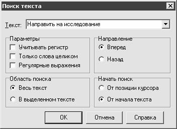 В данном окне в поле Текст следует с клавиатуры либо из раскрывающегося списка ввести текст, который необходимо найти. С помощью переключателя Направление выбирается направление поиска относительно расположения курсора: Вперед либо Назад (по умолчанию установлено значение Вперед). Следует учитывать, что, если в выделенной области Параметры установлен флажок Регулярные выражения, то переключатель Направление будет недоступным; это же относится и к флажку Только слова целиком.