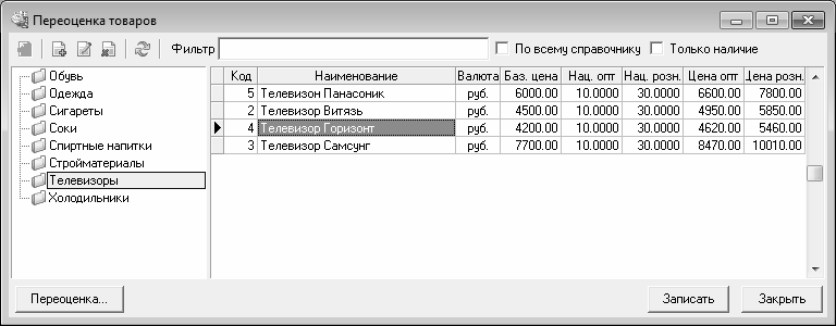 Как видно на рисунке, окно переоценки товаров разделено на две части. В левой части отображается список товарных групп, в правой части показано содержимое текущей группы. Например, на рис. 5.23 в справочнике показаны товары, включенные в товарную группу Телевизоры. Как нетрудно заметить, содержимое данного окна по своей структуре напоминает справочник номенклатуры (см. рис. 5.4).