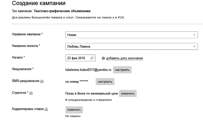 Уведомления на почту и по SMS мне посоветовали лучше не трогать. Человеку, не сильно разбирающемуся в Яндекс Директе, получение SMS о любом действии очень надоедает, а существенной пользы не приносит.